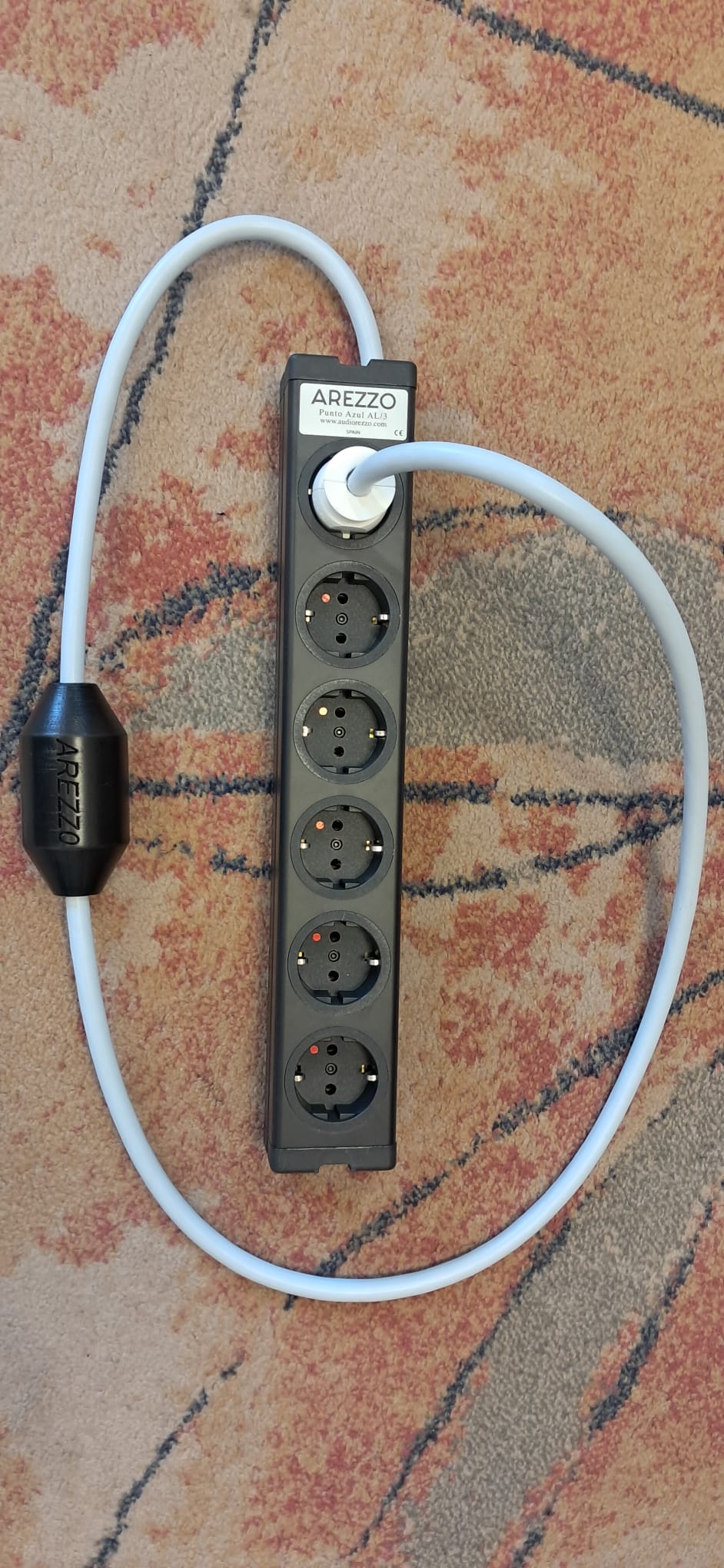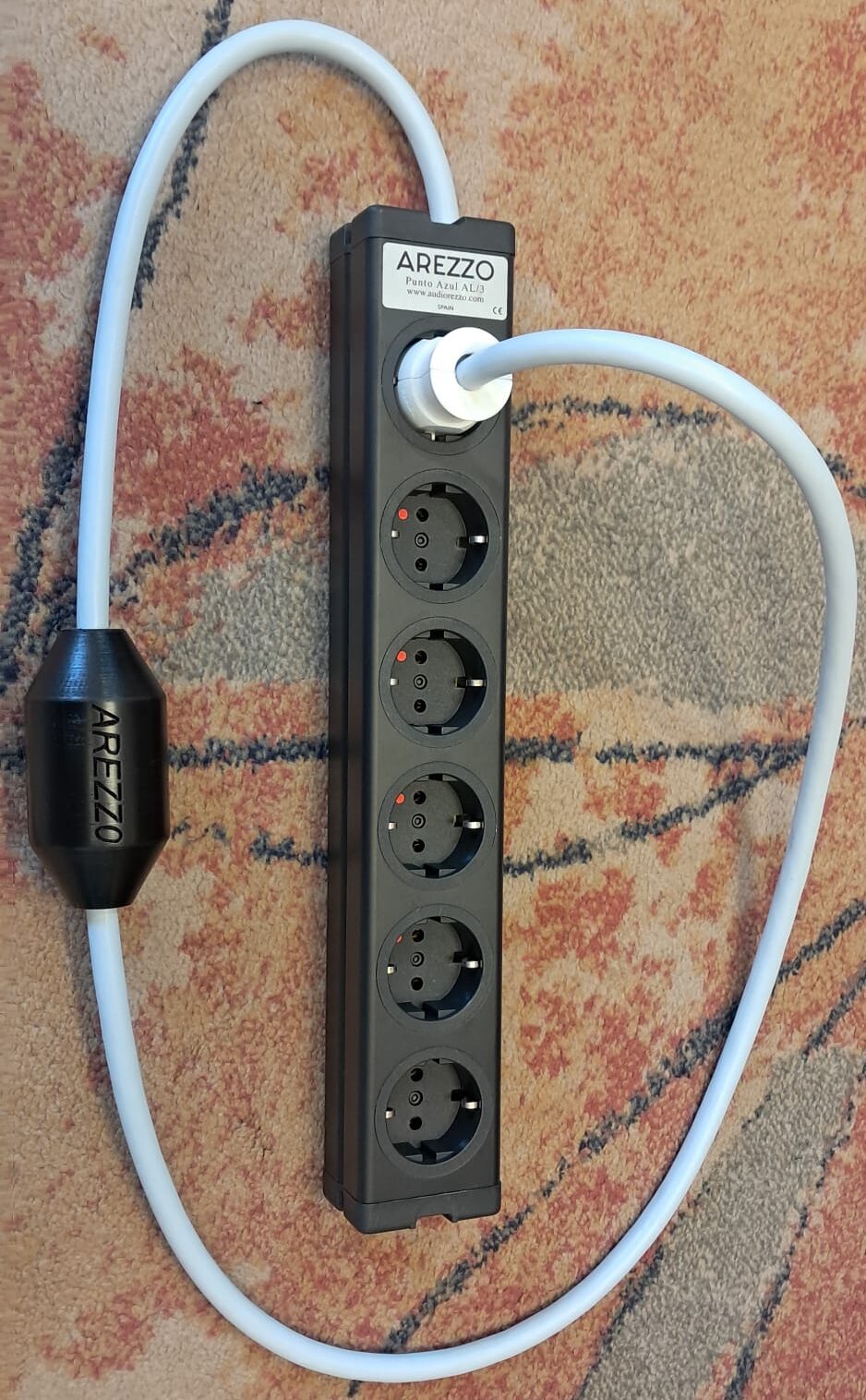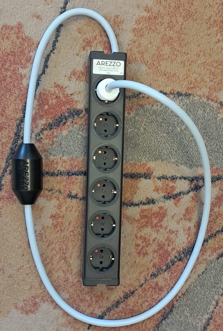 Esta base de red  se llama Arezzo Punto Azul AL/3 de seis tomas disponible, ocho tomas bajo pedido.  Es nuestra regleta básica con chasis de aluminio y tiene la tecnología de años de trabajo en nuestra búsqueda de una reproducción lo más natural posible del equipo de música conectado a ella.